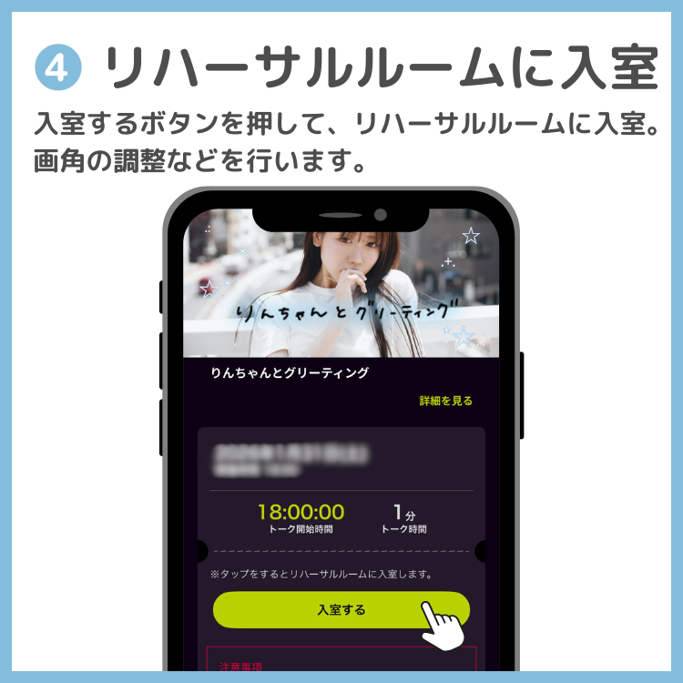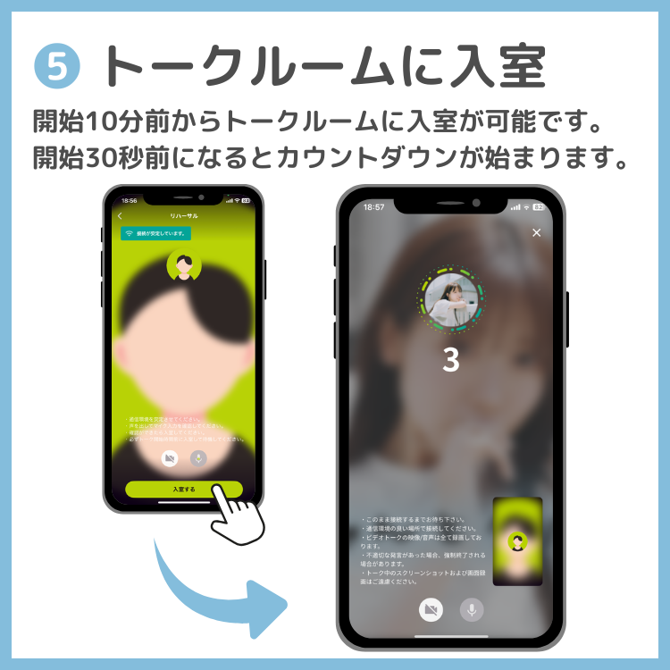 ※トークルームに入室後、チケットに記載のトーク開始時間になると、自動で画面が切り替わりトークが開始します。