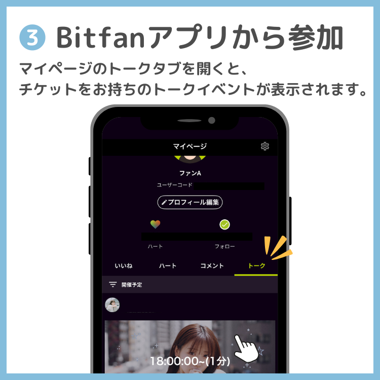 ※ビデオトークに参加するには、Bitfan IDの登録(無料)ならびに、Bitfan アプリ(アイコン背景が黒色のアプリ)のダウンロードが必要です。
